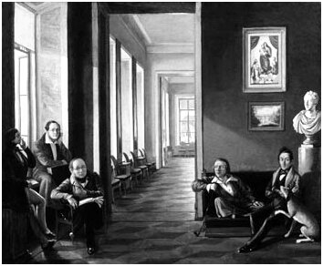 Н.B. ПОДКЛЮЧНИКОВ (1813-1877) Интерьер в квартире А.М. Филамофитского в Москве в Антипьевском переулке около улицы Волхонки. После 1835. Крайний справа у окна юноша, предположительно Г.И.Сокольский.